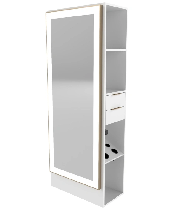 The Collins E1042 Essentials Formula Wall Station is made in the U.S.A. and is designed to be the perfect solution for all stylists and beauty professionals who want to keep it simple, yet stylish! The Essentials Formula Wall Station is a beautiful, fully functional styling station with extra storage options to keep your tools neatly organized and at your fingertips. This styling station features a built-in easy access tool panel, two full extension drawers, upper and lower storage compartments on the right side and two covered storage cabinets on the left side. The Essentials Formula Station is also available in more than 50 popular laminate colors and can be ordered with an optional matching mirror as an add-on to perfectly compliment your space. *Please allow 10 - 12 Weeks for shipment of special upcharge laminates.