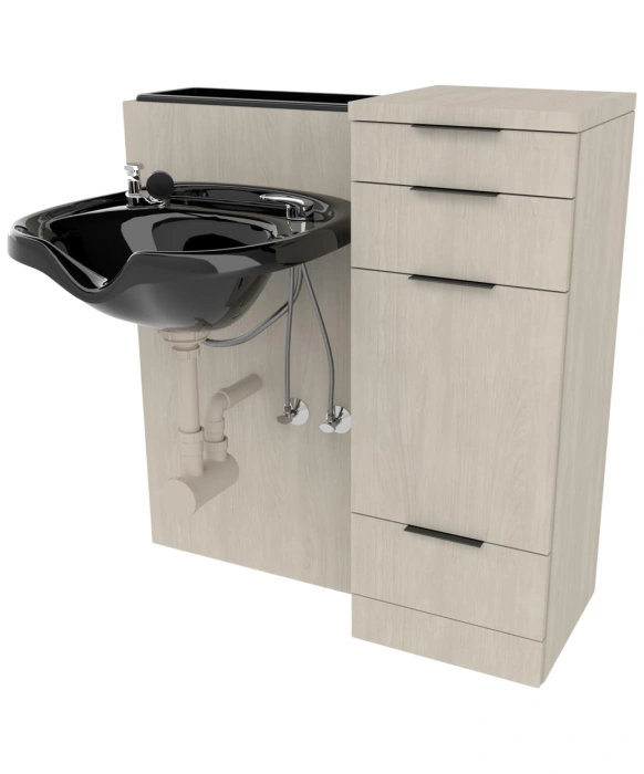 The Collins E1053 Nico Wet Station is made 100% in the U.S.A. which assures exceptional quality and great American craftsmanship. This modern wet station with its clean lines offers a fully equipped tip-out tool panel, top access molded bottle well, three full extension drawers, and a convenient six-outlet power strip. Available in a wide selection of popular laminate colors and 3 color options for the metal drawer pulls, the Nico Wet Station can easily be personalized to work with any shop décor. *Please allow 10 - 12 Weeks for shipment of special upcharge laminates. **Shampoo Bowl ordered separately