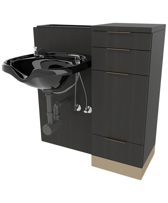 The E1053P Nico Wet Station w/ Accent Toe-Kick is made 100% in the U.S.A. which guarantees exceptional quality that is unmatched in the salon industry. This modern station with clean lines offers a fully equipped tip-out tool panel, top access molded bottle well, three full extension drawers, a six-outlet power strip and a metal accent toe-kick for a customized look. Available in a wide selection of popular laminate colors, 3 color options for the metal drawer pulls and matching metal toe-kick for a cohesive look, and 2 color options for porcelain or plastic bowls (bowl sold separately), the Nico Wet Station w/Accent Toe-Kick can easily be personalized to work with any salon design style. *Please allow 10 - 12 Weeks for shipment of special upcharge laminates. **Shampoo Bowl ordered separately