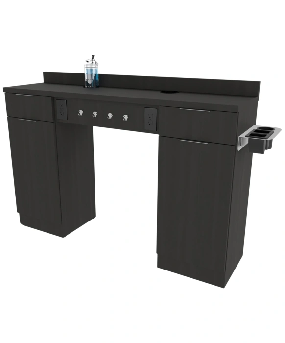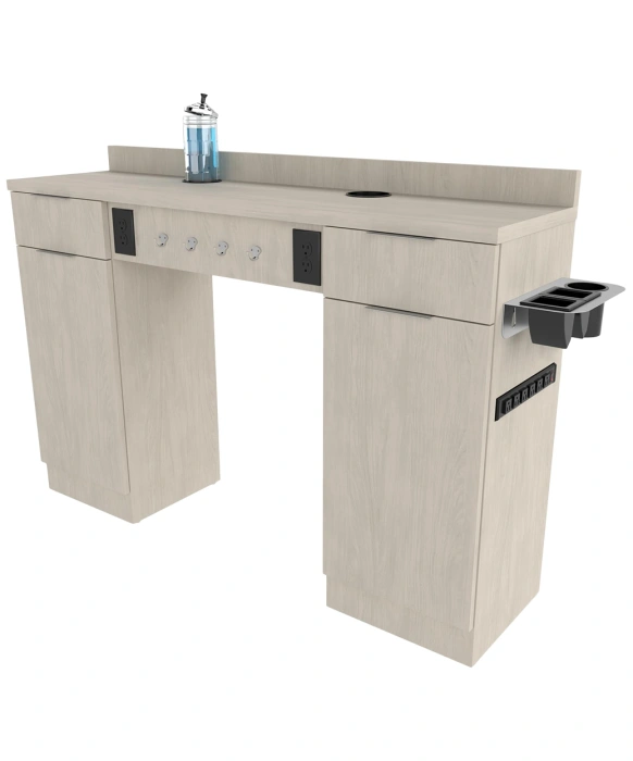 The Collins E1071 Finley Barber Station is 100% made in the U.S.A. by Collins using quality materials and craftsmanship ensuring years of stylish durability. The Finley Barber Station is built with convenience in mind and ships out completely assembled for hassle-free set up. The numerous features including four barbering clipper hooks, two front-facing duplex outlets, two extension drawers, two barbicide container holders, two spacious lower cabinets with adjustable shelves, a stainless steel barber tool panel and an optional six-power outlet make this professional unit ideal for all your barbering needs. The Finley Barber Station is available in a wide selection of popular laminate options and 3 color options for the metal drawer pulls, and you can also choose from various mirror options (mirrors sold separately) to complement this stylish barber station. *Please allow 10 - 12 Weeks for shipment of special upcharge laminates.