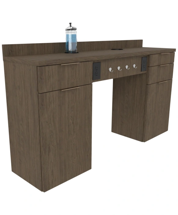 The Collins E1072 Aspen Barber Station is made 100% in the U.S.A. by using quality materials and fine craftsmanship ensuring years of stylish durability. This modern, wall-mounted barber station opens up your floor space while keeping all your styling and barber tools close. Available in a wide selection of popular laminates, you can choose from three color options for the metal cabinet pulls to customize the station to your decor. Featuring four clipper hooks, three full extension drawers, a full extension barber tool panel drawer, lower cabinet storage w/ adjustable shelf, two front-facing duplex outlets, two barbicide container holders and a six-outlet power strip this Aspen Barber Station is ideal for all of your barbering needs. **Please allow 10-12 weeks for shipment of special upcharge laminates.