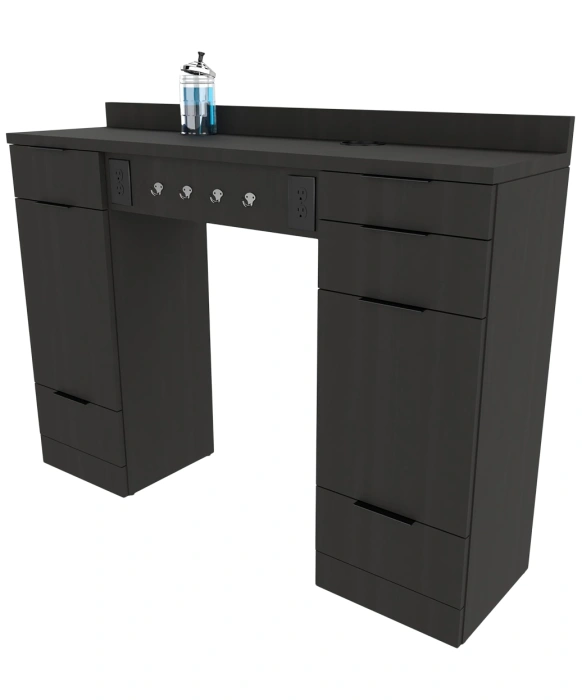 The Collins E1073 Nico Barber Station is made 100% in the U.S.A. ensuring lasting quality and fine American craftsmanship for stylish durability. This contemporary barber station is available in a wide selection of popular laminates and has a finished toe-kick for a cohesive look. The Nico Barber Station is well-equipped with numerous features including four clipper hooks, five full extension drawers, two barbicide container holders, storage on both sides, a six-outlet power strip, two front-facing duplex outlets, and a tip-out barber tool panel. You can easily customize this station with three color options for the metal drawer pulls to tie into your existing or new décor, making the Nico Barber Station a perfect addition to your space. *Please allow 10 - 12 Weeks for shipment of special upcharge laminates.