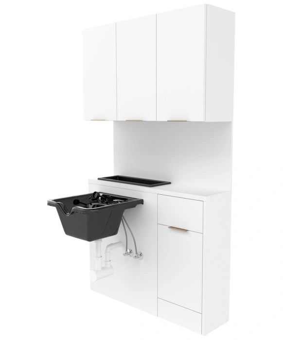 The Collins E1102 Premium Essentials Bulkhead w/ Upper Storage is Made 100% in the U.S.A. which guarantees exceptional quality that is unmatched in the salon industry. Available in a wide selection of popular laminates, the Premium Essential Bulkhead will help keep your shampoo area clean and organized. This bulkhead features three spacious upper cabinets with adjustable shelves, a full width backsplash, molded bottle well, generous surface space and an access door in the lower cabinet to store a soiled towel bin. This shampoo backbar is extremely versatile and can be used with a variety of add-on shampoo bowl and chair options that are ordered separately to perfectly accommodate your space. *Please allow 10 - 12 Weeks for shipment of special upcharge laminates. **Shampoo bowl & chair ordered separately