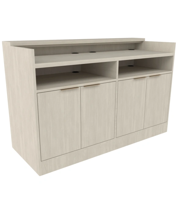 The Collins E1165-60 Nico Reception Desk w/ LED Accent Light is made 100% in the U.S.A. assuring excellent quality and fine American craftsmanship. This stunning unit accommodates more than one person to welcome & assist your clientele at check-in and also features a practical custom ledge for added guest convenience. Available in a wide selection of popular laminates, the Nico Reception Desk w/ LED Accent Light features a generous work area with two wire grommets, four storage cabinets w/ adjustable shelves, soft LED lights to accent the attractive front inset detail, and a finished toe-kick for a customized look. *Please allow 10 - 12 Weeks for shipment of special upcharge laminates.