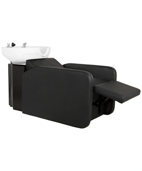 The Eclipse Backwash Unit w/ Electric Legrest is a professional lay-in style shampoo unit that combines simple elegance with superior comfort your clients are sure to love. This cutting-edge shampoo unit features an extra wide seat and an electric legrest that lifts and lowers with the press of a button to provide your clients with unmatched comfort. The full recline of the backrest combined with the electric legrest, allows the client to nearly reach a completely horizontal position offering the most enjoyable and relaxing experience. The Eclipse Shampoo Backwash also features a durable vinyl seat with added lumbar support and a porcelain shampoo bowl with built-in headrest for added comfort and stability. The porcelain shampoo bowl is available in black or white and comes complete with all hardware including a single lever faucet, durable shampoo hose, and a vacuum breaker. Your stylists and customers alike will love the elegant style and functionality of this shampoo unit during traditional shampoo services as well as Head Spa services of any style. The Eclipse Backwash Unit adds a touch of sophistication to your salon, spa or barber shop and goes well with any styling chair but it pairs particularly well with the Christina, Onyx or Lexus styling chairs!