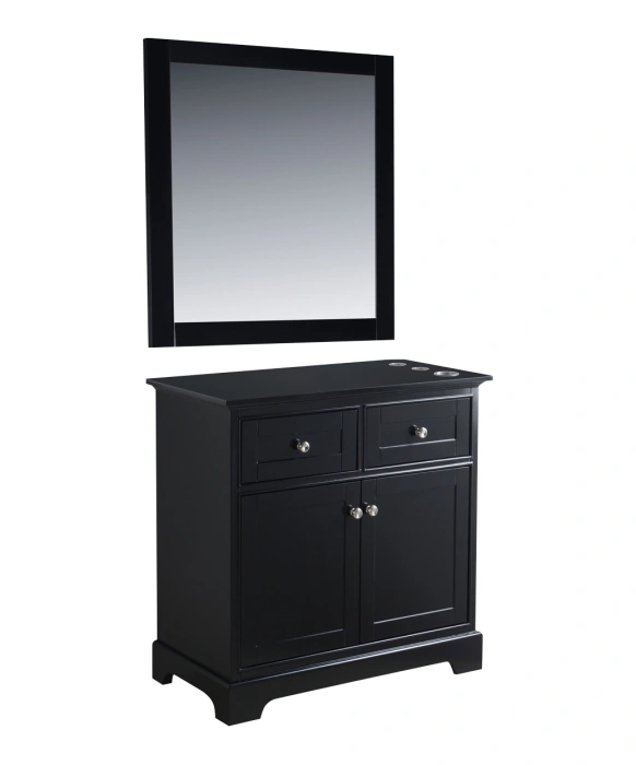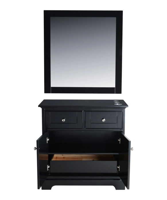 The Hudson 36" Black Vanity Styling Station & Mirror is professionally crafted from solid wood with a special attention to detail. As pictured, the Hudson Styling Vanity includes a solid wood base cabinet & framed mirror and features a rich black finish with tasteful detailing on its drawers and cabinets. This vanity styling station boasts two full-extension drawers and large lower cabinet with a middle shelf and extendable lower caddy! To promote a calming environment in your salon, all drawers and cabinets are accompanied by soft-close bumpers and extensions to prevent unwanted clatter. For added convenience, we’ve pre-drilled three tool holders into the station’s smooth upper work surface, and also included the stainless steel grommets as well. For your convenience, the Hudson Vanity comes to you fully assembled and is ready for immediate use upon arrival!