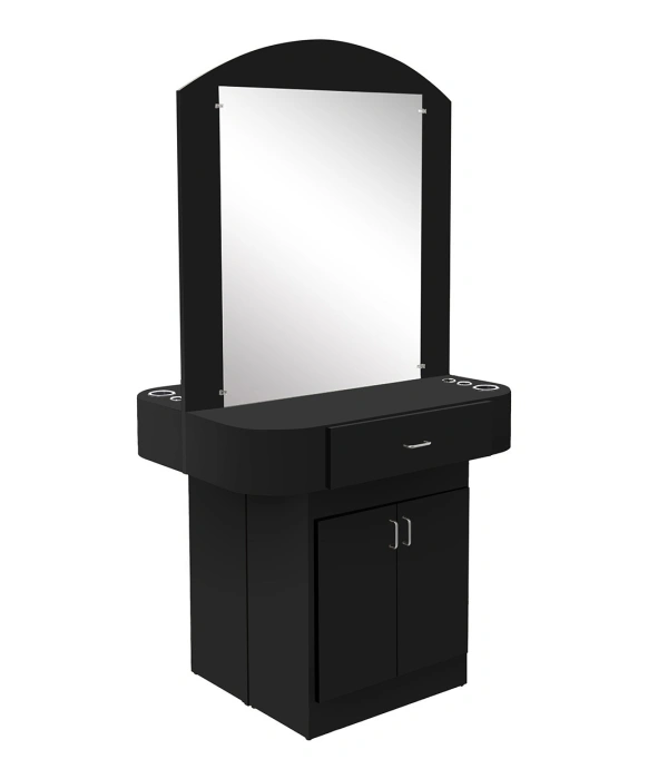 The Jazz Double-Sided Styling Station is Made 100% in the U.S.A. at the Buy-Rite Cabinet Shop and is available in 20 popular laminates. This free standing styling station is designed to accommodate two stylists' needs in a limited work space. Each side of the Jazz Double-Sided styling station features a 30" x 36" mirror a 24" utility drawer and a large storage cabinet with an adjustable shelf. For your convenience you have the option to add customizable appliance holders to this styling station as pictured. Please call our sales team at (800) 477-6655 to inquire about custom sizes and an optional lock.