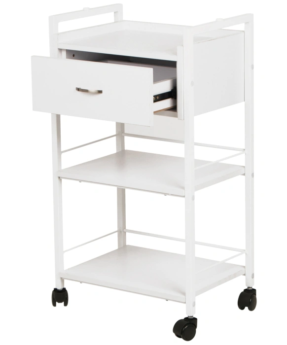 The Jenny Skin Care Utility Cart is great for estheticians and makeup artists alike as it is compact and extremely durable. This utility cart on casters is made of wood and features a large storage drawer, two storage shelves and it has post holes on both sides capable of holding a magnifying lamp. The Jenny Skin Care cart is portable, functional and will be a great addition to your salon or spa.