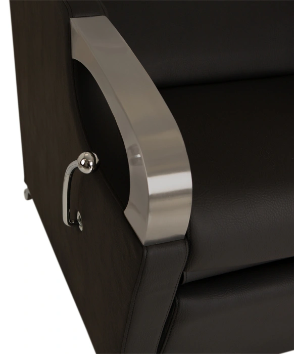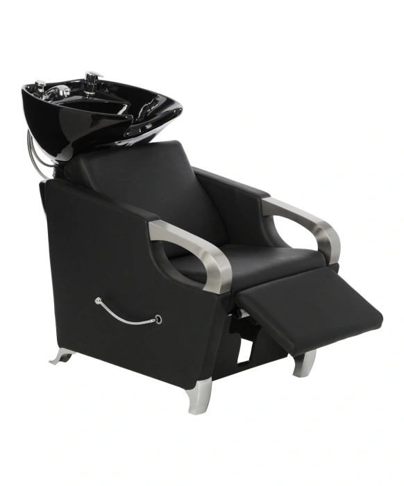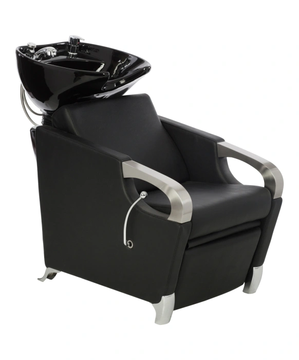 The Luna Shampoo Backwash Unit combines the best of style, functionality, and durability all molded into one. This shampoo unit features brushed chrome arm rests for great durability and a kick-out leg rest for great client comfort. The tilting mechanism for the porcelain shampoo bowl allows your client’s added relaxation which is maximized when using the footrest as well. The black vinyl exterior is outfitted with high density foam padding making it an extremely sturdy and dependable shampoo chair. The tilting porcelain shampoo bowl is available in black or white and comes complete with a European style single handed faucet, chrome shampoo hose and built-in vacuum breaker. The Luna Shampoo Backwash Unit is great when paired with the Luna Styling Chair offering complete design continuity across your salon.