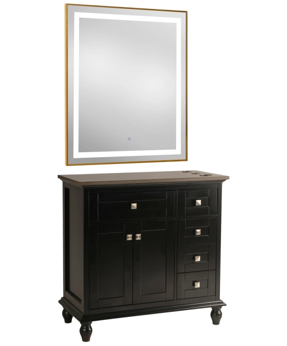 The Madison 36" Vanity Styling Station & Mirror is built from solid wood with great quality and attention to detail in mind. As pictured, the Madison 36" Black vanity features a beautiful Black finish and an Espresso Quartz top work surface. In addition to its large centered main drawer and cabinet, this vanity station features four full-extension drawers that line the right-hand side of the station to provide for ample storage for every stylists daily needs. This vanity station also features upgraded hardware with DTC soft closing door hinges and drawer slides to prevent unwanted clatter. The Madison station comes standard with a solid wood black frame mirror but can be upgraded to a modern LED mirror as well. The spacious quartz counter-top features built in appliance holders for your tools and it is easy to clean and maintain. The station’s open underside provides a clean look, while also allowing for easy cleanup. The Madison 36" Vanity station ships fully assembled is ready to go with a hassle-free set up.