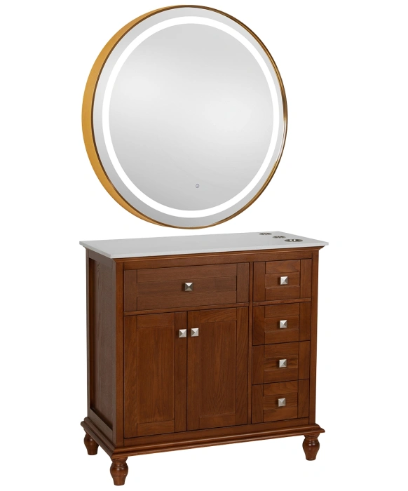 The Madison 36" Vanity Styling Station & Mirror is built with from solid wood with great quality and attention to detail in mind. As pictured, the Madison 36" Walnut vanity features a beautiful Walnut Wood finish with a White Quartz top work surface. The Madison Vanity’s intricate finishes, tasteful detailing, and bun feet are sure to bring a simple sense of sophisticated elegance to any space that it consumes. In addition to its large centered main drawer and cabinet, this vanity station features four full-extension drawers that line the right-hand side of the station to provide for ample storage for every stylists daily needs. These vanity stations also feature upgraded hardware with DTC soft closing door hinges and drawer slides. The spacious quartz counter-top features built in appliance holders for your tools and it is easy to clean and maintain. The station’s open underside provides a clean look, while also allowing for easy cleanup. The Madison Walnut Vanity styling station comes complete with a matching wood frame mirror or it can be upgraded with your choice of (4) modern LED mirrors that work perfectly with this styling station.