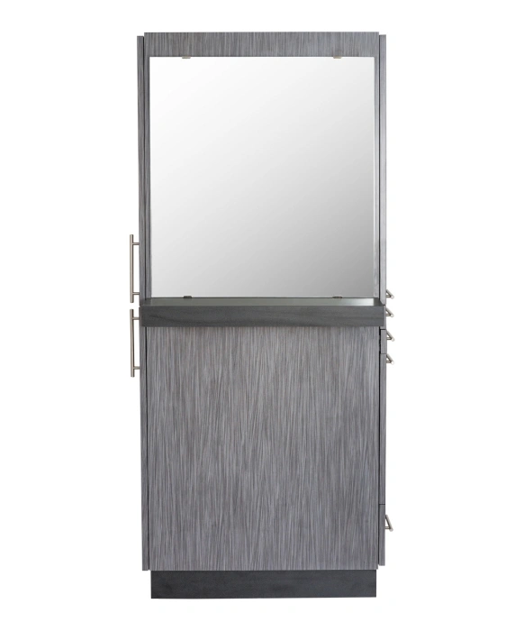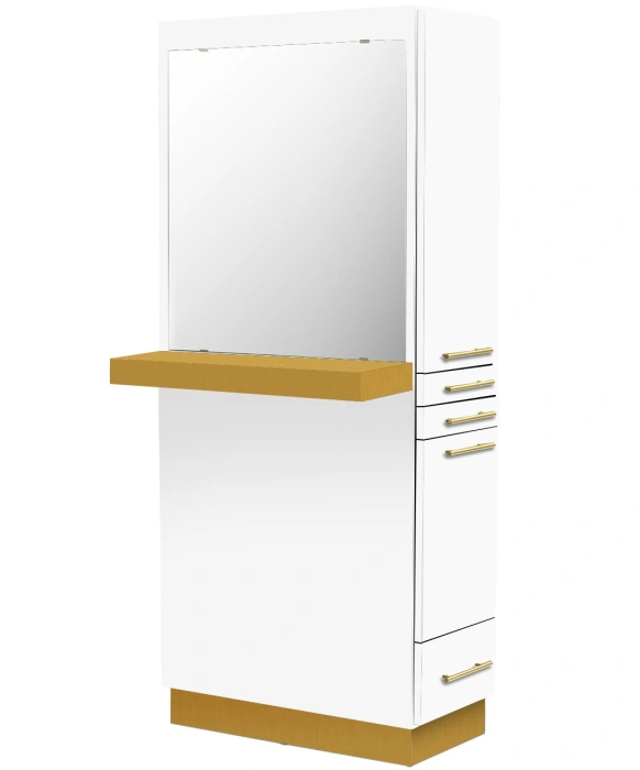 The Maxim Styling Station w/ Ledge is 100% Made in the U.S.A. and is built with the utmost craftsmanship found in the salon equipment industry. This free-standing salon styling station ships to you fully assembled and comes complete with a front ledge & 30" x 28" mirror. The right side of the Maxim Styling Station features an upper storage cabinet, two utility drawers, a storage cabinet with a slide-out tool panel to accommodate one blow dryer and two curling irons, as well as an extra lower drawer for additional storage! The left side of the station offers even more storage space with two large cabinets. This station is designed with style and functionality in mind, and is sure to suit any salon décor! The Maxim Styling Station is available in your choice of 40 laminate colors with two tone options, so ask your Buy-Rite Beauty Sales representative today!