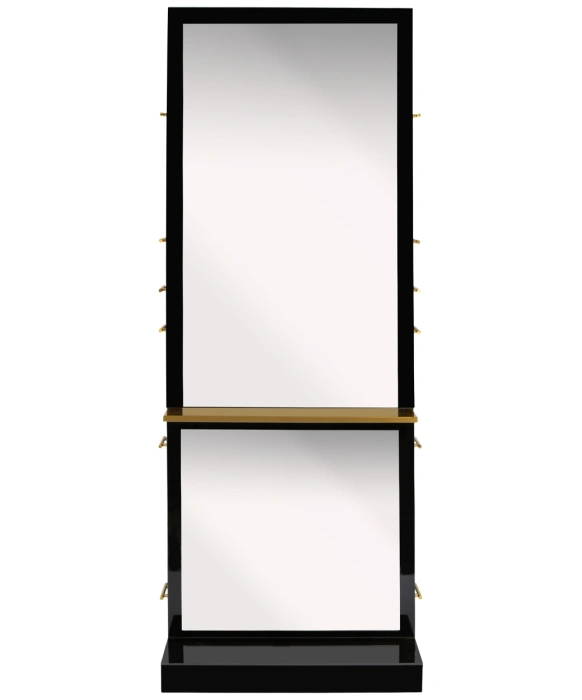 The Milan Double-Sided Styling Station with Shelf by Buy-Rite Beauty will elevate your salon with clean, modern lines and enough storage for two stylists. With organization and storage at the forefront of this design, this double-sided station features a large cabinet with adjustable shelf at the top, two standard storage drawers, one scissor drawer, a pull-out tool appliance drawer, and a spacious bottom drawer on each side. This styling station also features a full-length metal shelf and mirrors on each side. The Milan Double-Sided Styling Station comes in either a black gloss or white gloss finish, and the accent shelf and handles come in either gold, silver, or black to fit seamlessly into any aesthetic. Some additional features include hidden wheels on the bottom for easy maneuverability throughout the space and pre-cut outlet holes on both sides to easily run electrical wiring through the interior of the station. This styling station is the perfect addition for salons who are looking for a beautiful and modern design that offers ample storage. Check out our Milan Single-Sided Styling Station if you love the design of this station but are looking for the single version.