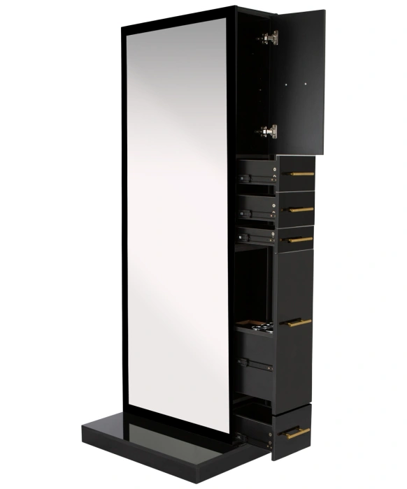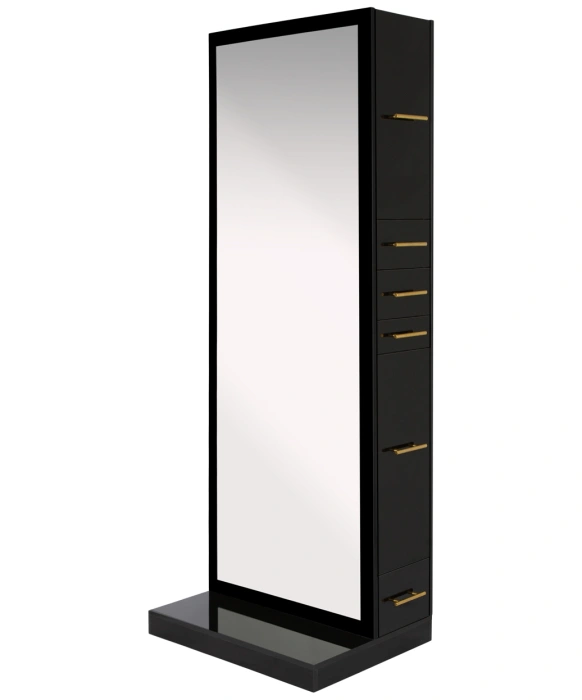The Modena Single-Sided Styling Station by Buy-Rite Beauty will elevate your salon with a modern flare without compromising storage and functionality. This styling station comes with ample storage space to keep tools and products out of sight but within reach. The Modena Station includes a full-length mirror, 3 storage cabinets with adjustable shelves, two middle drawers, one spacious bottom drawer, a pull-out scissor drawer, and a slide out appliance drawer with metal tool holders. The Modena Styling Station comes in either a gloss black or gloss white finish and offers handles in either gold, silver, or black for added design flexibility. This styling station is a perfect space-saving solution at 30" wide, and it has hidden wheels on the bottom to maneuver throughout your space as needed. Additionally, this station is electrical ready with a pre-cut hole in the appliance drawer to keep your wires out of sight and ready to run electrical wiring through the interior of the station. Indulge your clients with this stunning styling station that marries modern design with ample storage and functionality. If you are looking for the double configuration of this styling station, check out our Modena Double-Sided Styling Station.
