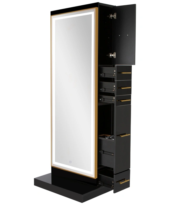 The Modena Ultra Double Sided LED Styling Station by Buy-Rite Beauty is an all-in-one station offering stunning modern design and unmatched functionality. This styling station is designed to service two stylists at once featuring a full-length LED mirror, cabinet with adjustable shelf, four storage drawers and a slide out appliance drawer with metal tool holders on each side. The Modena Ultra Station comes with multiple LED mirror options and is avaialble in either a gloss black or gloss white finish and 3 handle color options; gold, silver, or black to fit your aesthetic vision. This double styling station is great for space saving at 30" wide and it has hidden wheels on the bottom for easy maneuverability throughout your salon. Additionality, this station is electrical ready with a pre-cut hole in the appliance drawers to keep your wires out of sight and ready to easily run electrical wiring through the interior of the station. The Modena Ultra Double-Sided Styling Station is ideal for those looking for a top-quality styling station with a stunning modern design. If you are looking for the single configuration of this styling station, check out our Modena Ultra Single-Sided Styling Station.