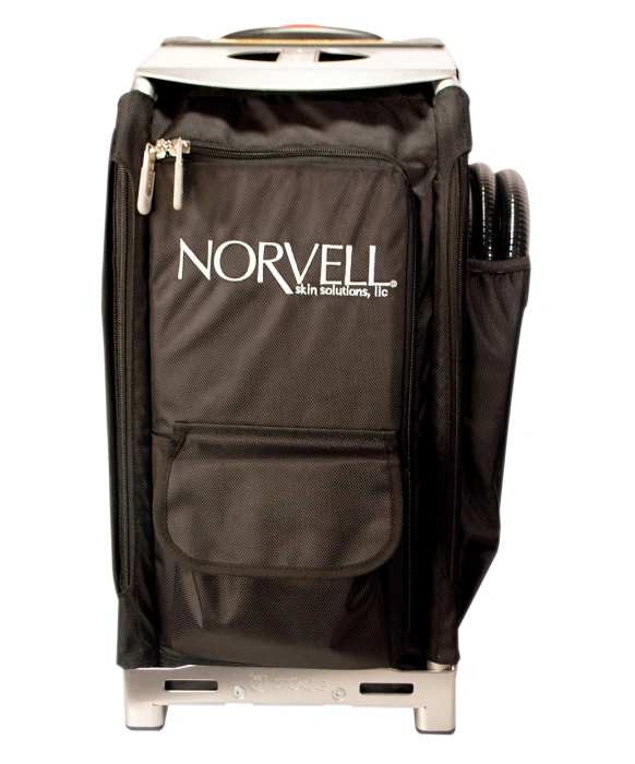 Take your business on the road with the Norvell(R) Pro Travel Bag, the perfect accessory for the on-the-go spray tech. This lightweight yet sturdy rolling bag was designed by the Norvell(R) team specifically to provide a solution to our mobile tech's needs. The interior provides easy-access portals and storage for hoses, cords, and essentials. A built-in shelf on the interior easily stores 2 liters of solution, plus additional necessities. Inside the front flap are multiple pockets to organize your Neat Feet(TM), eXmitts, and other disposables. A convenient gun hook mounts on the telescoping handle for spraying ease.