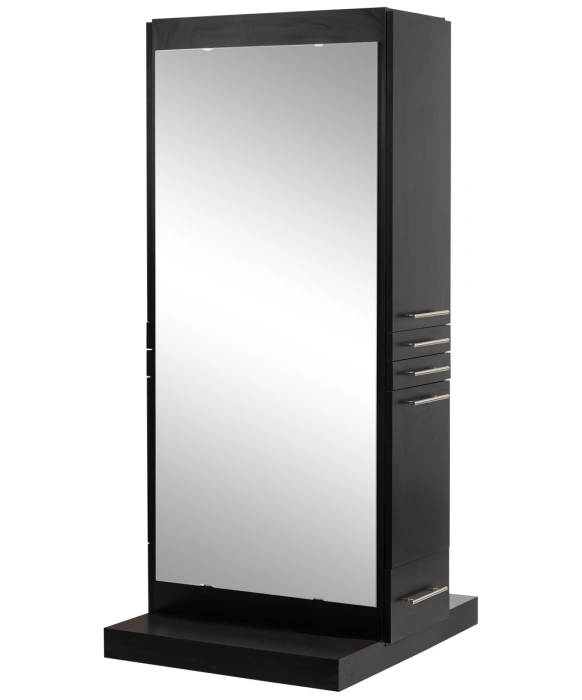 The Omni Double Styling Station w/ Mobile Base features clean, modern lines and is double-sided to support two stylists at the same time. This free-standing styling station comes complete with (2) 60" full-length mirrors and ships to you in two fully assembled pieces for easy installation. Each side of the Omni Double Sided Styling Station is identically equipped with an upper storage cabinet, two utility drawers, a slide-out tool panel to accommodate one blow dryer and two curling irons, as well as one lower drawer for additional storage! This dual sided styling station features hidden wheels on the bottom for easy cleaning & maneuverability throughout your salon. This feature would be a great asset to any cosmetology school looking to create an easy transformation from classroom to hands-on work space. The Omni Double Styling Station is available in your choice of 40 laminate colors to perfectly match your salons look and feel. And if you only have the need for (1) stylist at this station we offer the Omni Styling Station w/ Mobile Base.
