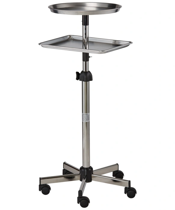 The Pibbs ART68 Metal Mayo Utility Tray is fully height adjustable and the perfect size for a multi-use salon tray. This tray comes on wheels and can be easily moved from station to station throughout the salon. This unit has a 16.5" round metal utility tray that can be used for a wide variety of services including coloring, chemical services, or just to simply hold tools for easy access. In addition to the metal round tray on the top, this unit comes with an additional rectangular tray directly underneath that can be used for storing waste material, additional products, or tools for servicing. The base of the unit has a sturdy five star chrome support and metal frame that serves as the foundation of this durable unit.
