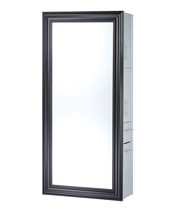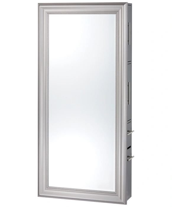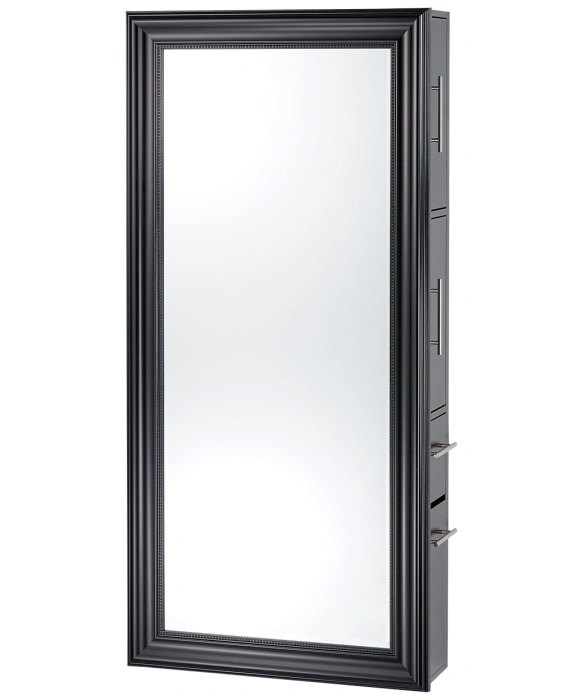 The Pibbs Classic Salon Mirror & Storage Server is an elegant floating styling station that brings a classic, clean look to any salon. Available with a silver or black frame, the extra-large, full-length mirror is framed by a refined, yet ornate design with curved edges and a dotted accent. The server is available in black or white, and features 1 pull out tool panel with tool holders – 1 with wire access to keep the drawer closed while using your tools, 1 utility drawer, 2 spacious storage cabinets on the right side, 2 large storage cabinets on the left side, and durable metal bar pulls. Keep your salon station looking clean with the extensive storage and small footprint of the refined, luxurious Pibbs Classic Salon Mirror & Storage Server We also offer the Pibbs Class Salon Mirror for design continuity across your salon.