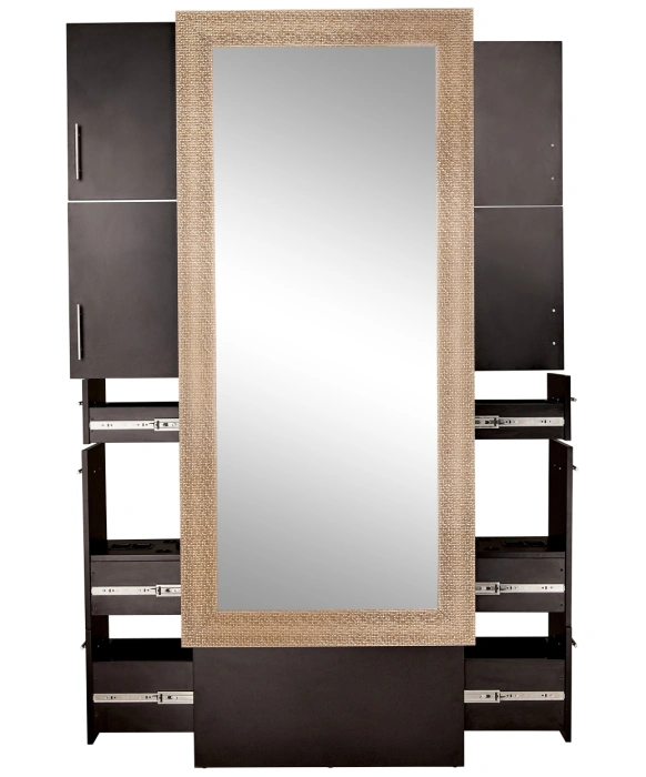 The Pibbs Diamond Mirror Double Sided Station will add style and functionality to any salon or spa while also saving space. This styling station comes complete with two full-length diamond framed mirrors that are available in 4 vibrant color options. The wood styling station is available in black & white and features an appliance pull-out drawer, two regular storage drawers and two storage cabinets on each side of the double station. The Pibbs Diamond Mirror Double Sided Station has a small footprint with plenty of storage space and is designed to be used by two stylists at the same time. If you are looking for a versatile styling station to help save space that offers great design and functionality then you have found the one!!