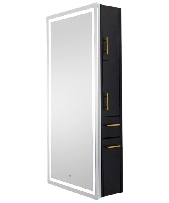 The Pibbs 9110 Lumina Gold Handle LED Salon Mirror & Storage Server add a clean & modern touch to any salon, spa or barbershop. The extra-large, full-length mirror features a built-in dimmable LED light with an easy and accessible on/off button, that will bring a refined glamour to your styling station. The wood server is available in 5 vibrant color options and features beautifully finished gold metal bar pulls, 1 tool holders with wire access to keep the drawer closed while using your tools, 1 utility drawer, 2 spacious storage cabinets on the right side, and 2 large storage cabinets on the left side. The beautiful Pibbs Lumina LED Salon Mirror & Storage Server has a small footprint with plenty of space for products and storage, and brings an opulent elevation to any upscale salon or spa. And if you need an additional mirror to match this luxe server we offer the Pibbs Lumina LED Salon Mirror. *Please allow 2 - 4 weeks for shipment of server colors other than black.
