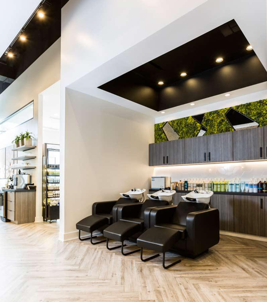 Once you’ve chosen your aesthetic, stick to it. You want your entire salon design to feel cohesive. If you want a shabby-chic entryway, your stations should match. If your waiting area is done entirely in blacks and whites, carry that scheme throughout the space. You don’t want your clients to walk from one area to the other and feel like they’ve stepped into a different salon. In the salon pictured above, our client chose the Kite Styling Chair and Iconwash Backwash Unit for their matching style and color options that flow well with the rest of the salon.
