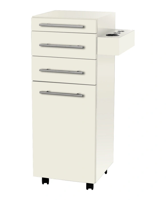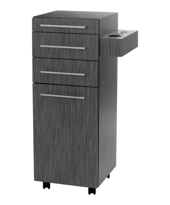 The VM Portable Styling Station is made 100% in the U.S.A. and depicts excellent craftsmanship, functionality, and affordability. This portable styling station is shipped fully assembled and is available in 20 popular laminate colors to perfectly match your salons decor'. The VM Portable features a scissor drawer, two appliance drawers, lower storage cabinet with adjustable shelf, and an appliance arm with one blow dryer and two curling iron holes. The VM Portable styling station is also outfitted with 11” brushed chrome handles and sits atop four industrial strength casters to ensure smooth and effortless mobility.