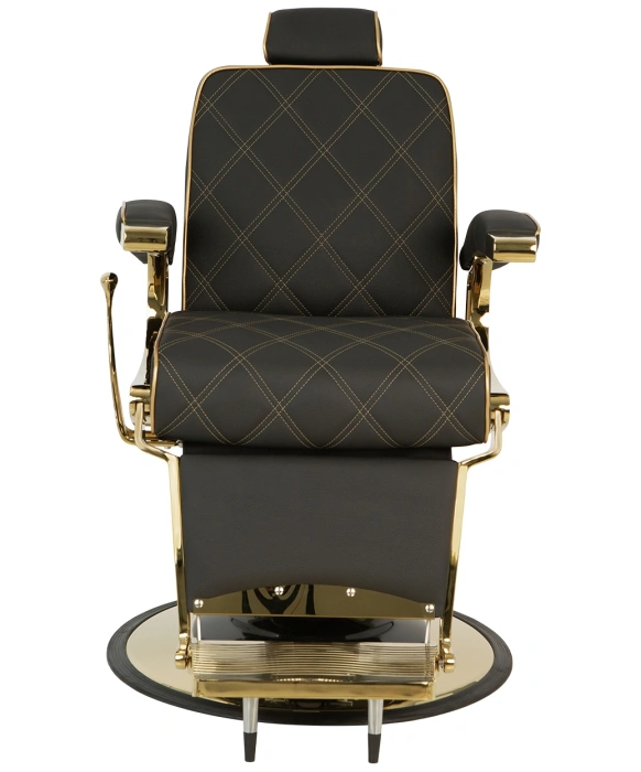 The Zeus Gold Professional Barber Chair is an eye-catching, classic barber chair that offers great durability and unmatched functionality. This professional barber chair features intricate details on the vinyl with reinforced gold diamond stitching and gold piping on the edges to match the stunning gold metal frame. The Zeus Gold Barber Chair also features an extra wide seat combined with a durable platform footrest and an adjustable headrest that will accommodate clients of all sizes and provide superior comfort during their service. This barber chair comes complete with a heavy-duty hydraulic pump with a 2-year warranty and an oversized gold base that offer exceptional stability. With its combination of eye-catching style, unmatched durability, and contemporary features, the Zeus Gold Barber Chair will add years dependable service and great style to any new or existing barber shop!